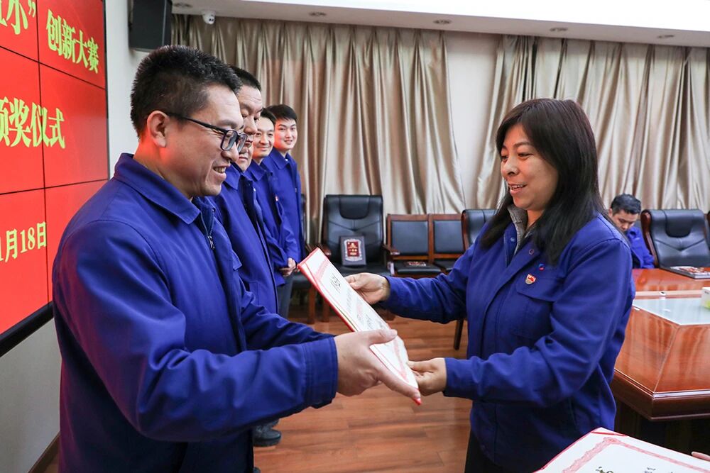 白玉梅为获得省、市“五小”创新大赛奖项的团队代表颁奖。她鼓励大家要以此次获奖为新起点,永葆敢闯敢试的创新热情,立足岗位深挖科研生产中的堵点、难点、痛点,让每一个创新想法都能对接实际需求,让“五小”成果成为降本增效、优化流程的金钥匙,成为推动企业科技进步、转型发展的催化剂。要强化成果转化的实践意识,进一步推动获奖项目变成落地效益,应用到更多领域更多产品。要当好创新引领的排头兵,带动身边同事参与创新实践,分享创新思路与经验,让“人人可创新、处处能创新”的氛围在集团公司蔚然成风,为集团公司高质量发展注入源源不断的内生动力。