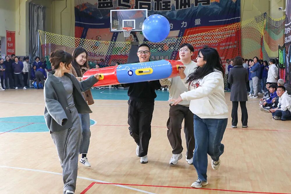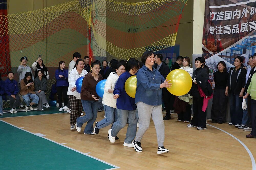 赛场上,各项目亮点纷呈:“飞盘九宫格”前,手起盘落间尽显精准与策略的博弈;“毽影飞扬”区,脚尖轻挑中,团队协作的节奏感瞬间拉满;“同心击鼓”处,各色瑜伽球在鼓面默契跳跃,每一次起落都是齐心协力的见证;“心心相印”项目里,队员们前胸贴后背夹球狂奔,滑稽的“企鹅步态”屡屡引爆全场欢笑;三步跨栏接力赛道上,运球、突破、投篮一气呵成,矫健身影诠释着运动激情。